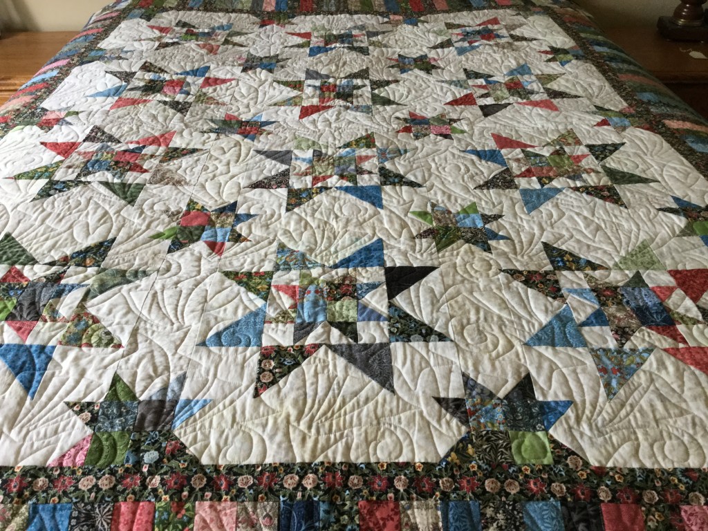You will need about 3.5 metres of background fabric and you could use just one or a couple fabrics for the blocks and a third for the sashing. For the stars you will need a total of 3.5 metres so the equivalent of 14 fat quarters. And 1 metre for the inner border and the binding. But you can always make a smaller quilt!