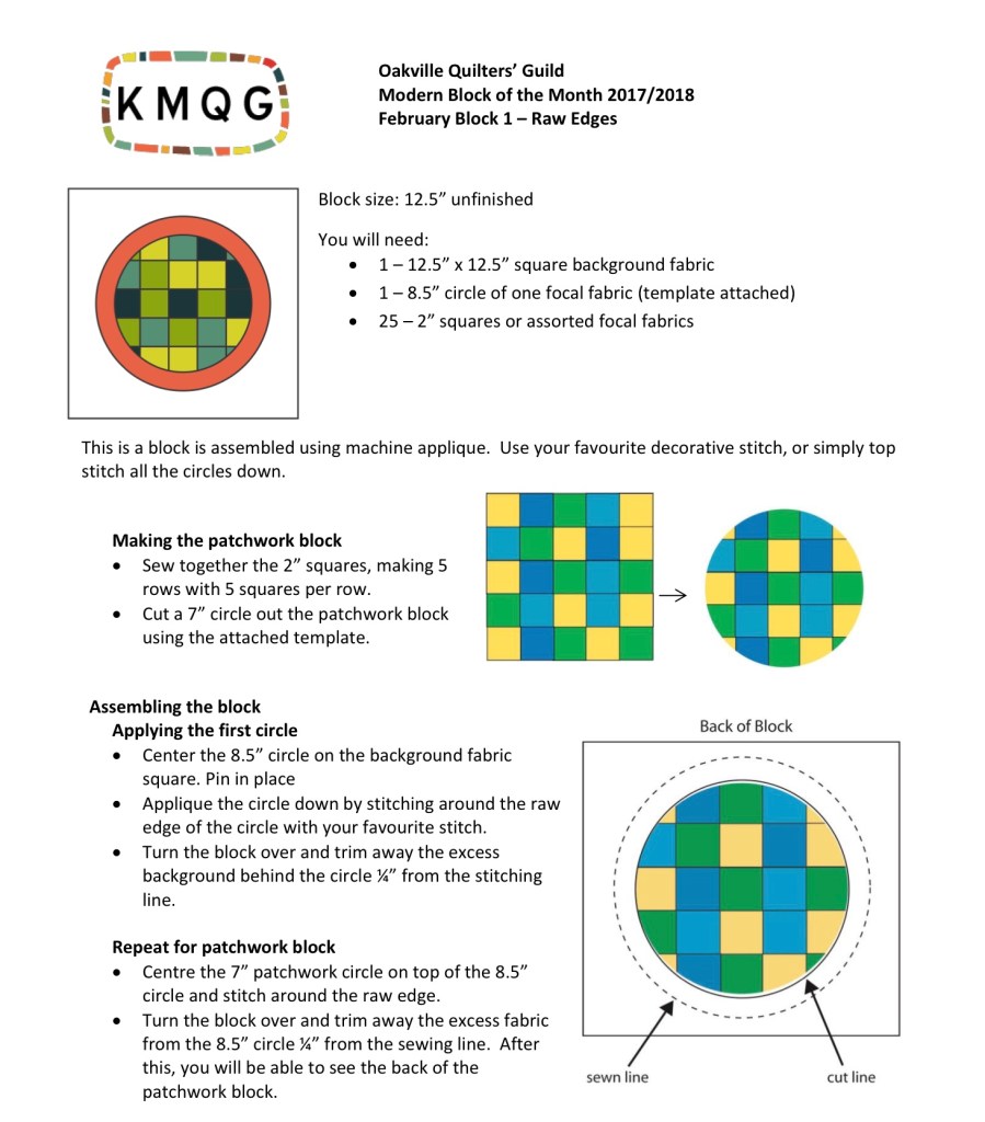 We have 2 blocks to do this month. We will start with “Raw Edges” and release “Curves” in 2 weeks! You can find the PDF here and Sandra’s instructional blog post here! Be sure to print page 2 of the PDF, the circle template, at “full size” or “100%” or “no scaling”. Or skip that step and use household bowls to draw your circles! The measurements are 7” and 8.5”!