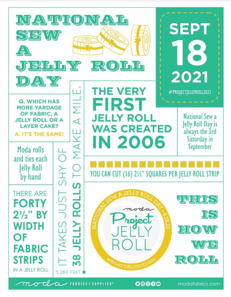 Moda, the inventor of the jelly roll, has designated Saturday, September 18th as “National Sew A Jelly Roll Day”. Completely self promoting, but wouldn’t it be fun to sew together? We can, through the magic of Zoom! And our Sit and Sew anytime Zoom link!