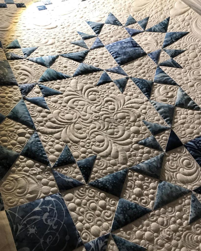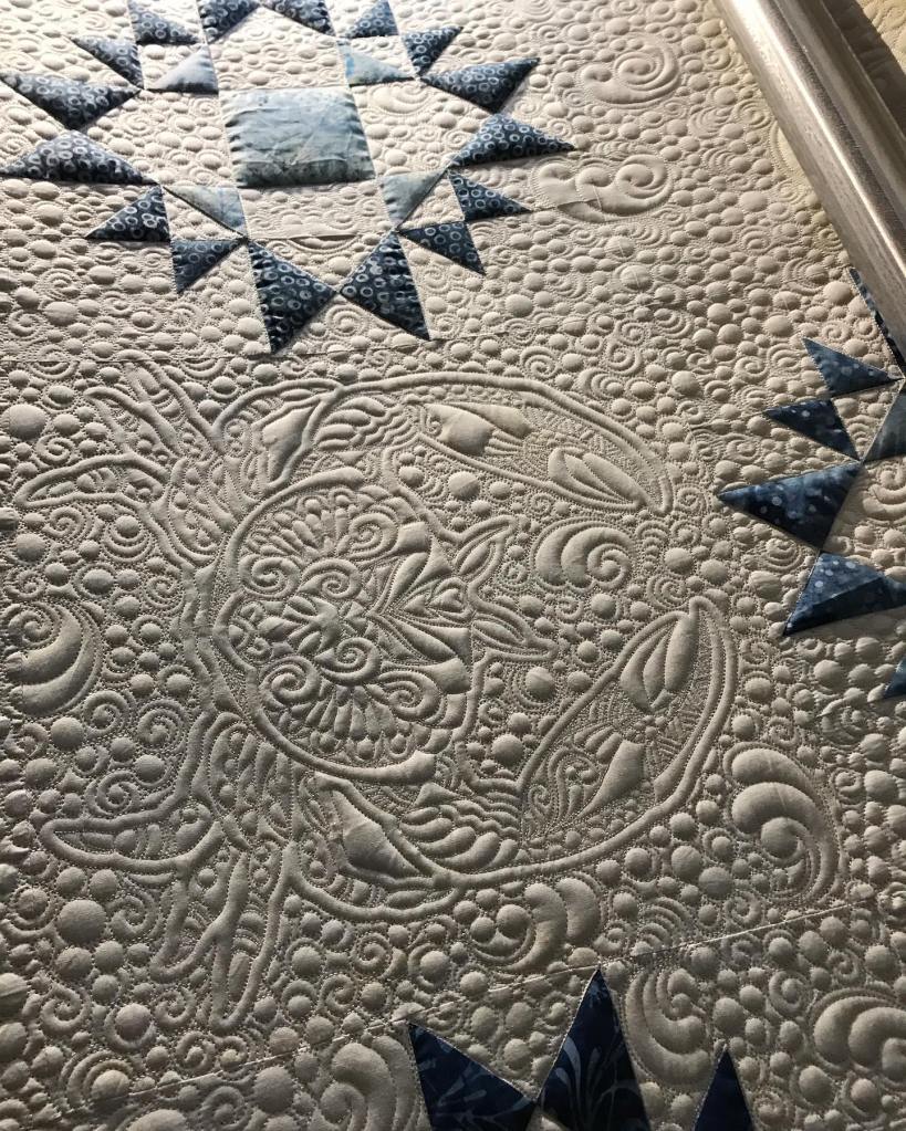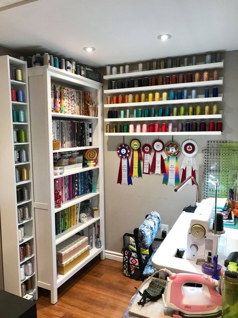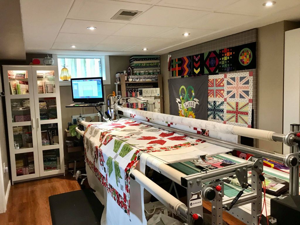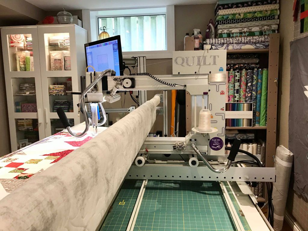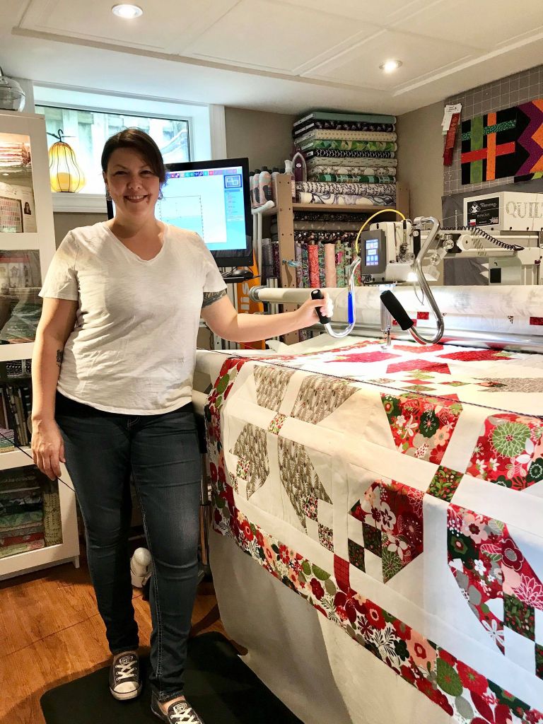 “Hi Everyone I’m Sarah Yetman of Spooled Rotten Quilts. I operate a small longarm business out of my home in Brantford. I made my first quilt in 2009 when I was on maternity leave with my first child and was hooked. I quickly realized I was getting into this in a big way. I was drawn especially to free motion quilting and knew I wanted to tackle it. I worked kind of obsessively on my domestic machine to FMQ (free motion quilt). This went on for about 6 years, building my skills. By this point I made a huge decision to follow my passion and take the leap into longarming. With the help of an inheritance I purchased my longarm and left my retail job. Although going into business for yourself can be a challenging, at times scary decision. I am so glad I took that chance. After much thought I decided on purchasing an Innova longarm. This machine, over the years like the domestic before her, has become an extension of me. Today I offer edge 2 edge digitized quilting services as well as custom work. I continue to practice FMQ on my longarm as the learning never stops with this amazing art we all love so much. I work in a small shared space and make the most of every nook and cranny! Most recently I was so honoured to quilt a piece for Sherri Hissey of Border Creek Station that was featured in the yearly quilt calendar for American Patchwork and Quilting. I consider myself so lucky to be able to do what I love everyday and continue to be inspired by the beautiful pieces my clients allow me to quilt for them. ❤”