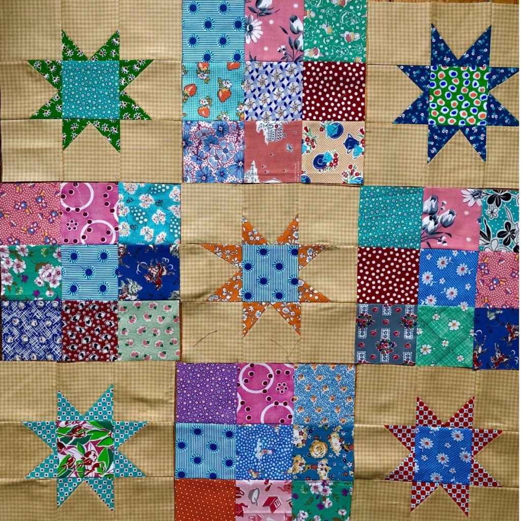 I’ve also started a second version of Star Hollow, using setting #3 from the instructions – because I couldn’t resist the pull of my small bits of remaining 30’s fabrics. My 9 Patches are in the classic “mishmash” setting. But you could be more organized and use a traditional 4- or 5-placement position of matching fabrics in the 9 Patch that will give you a crisscross pattern throughout.