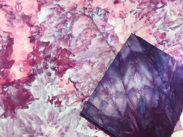 I used the dripping from the ice dyeing and got some lighter shades of purple and blue. You need to add a little more soda ash water if the dye has sat for more than four hours as the chemical reaction will make the dye inactive.
